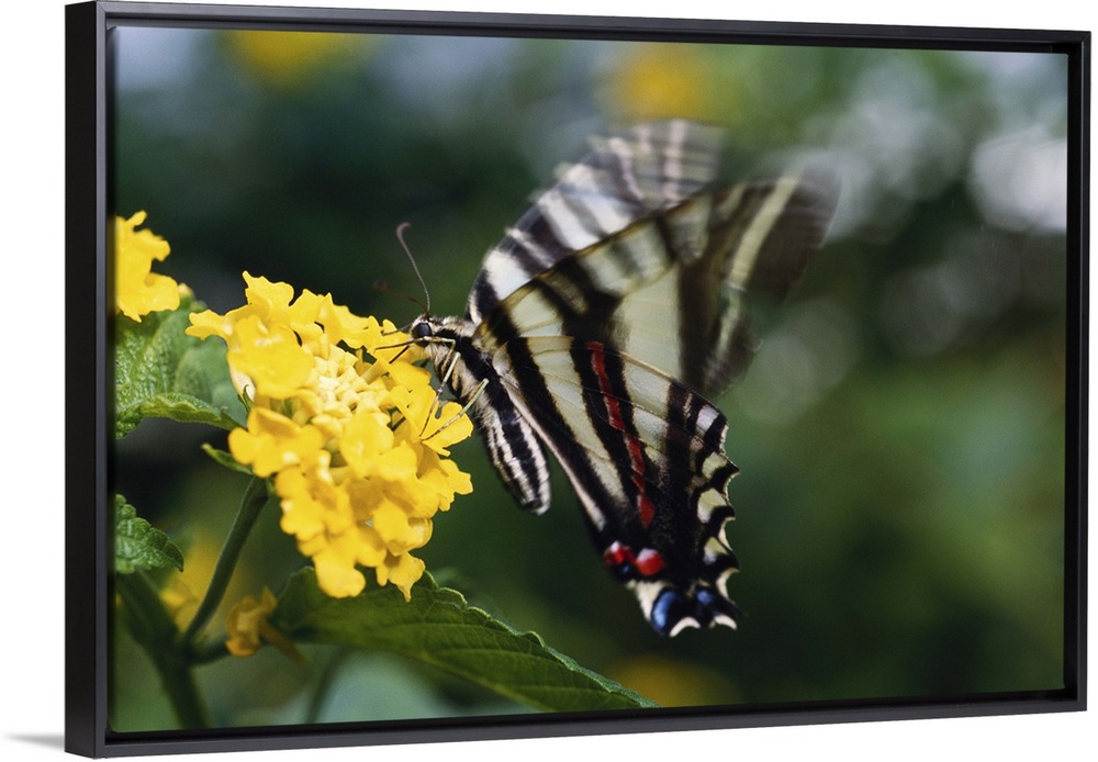 <p>A butterfly, in the family of Swallowtails or Papiliondae (Latin) on a yellow flower. There is motion in the beating wings. Taken on a sunny afternoon.</p>