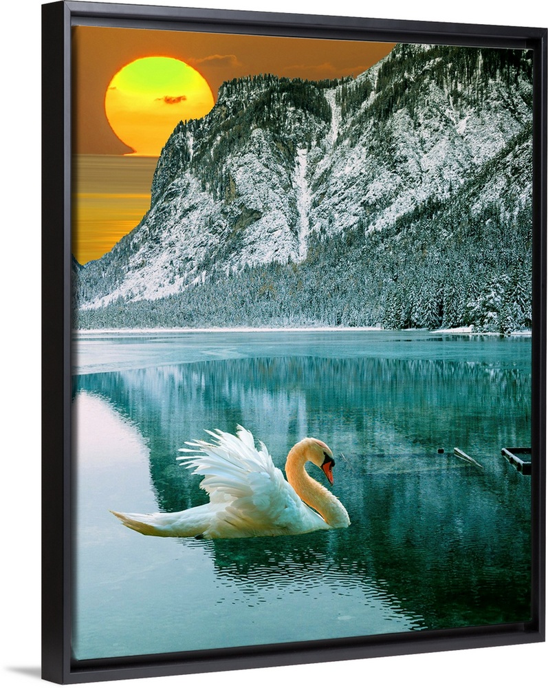 <p>A contemporary surrealist collage of a swan on a calm blue lake in front of a snowy mountain and a setting sun</p>