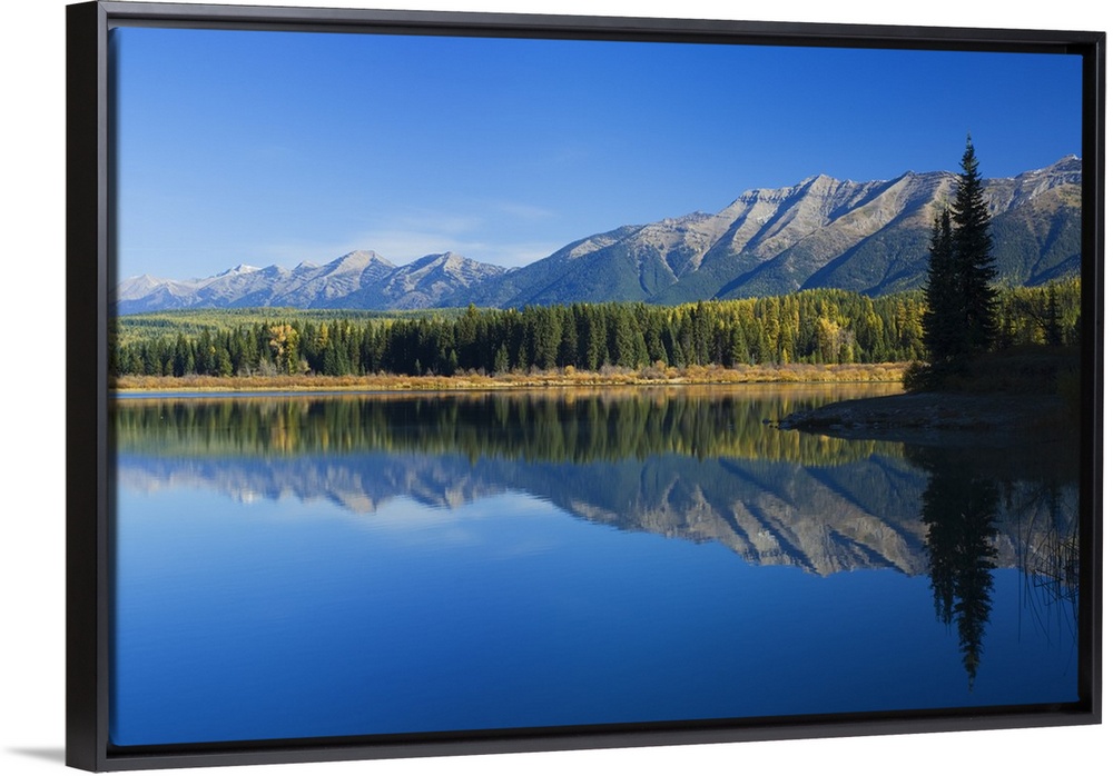 <p>Big canvas photo of mountains and their reflection onto the lake in front of them.</p>