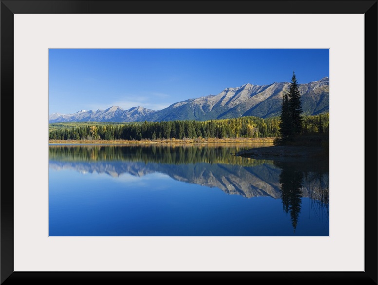 <p>Big canvas photo of mountains and their reflection onto the lake in front of them.</p>