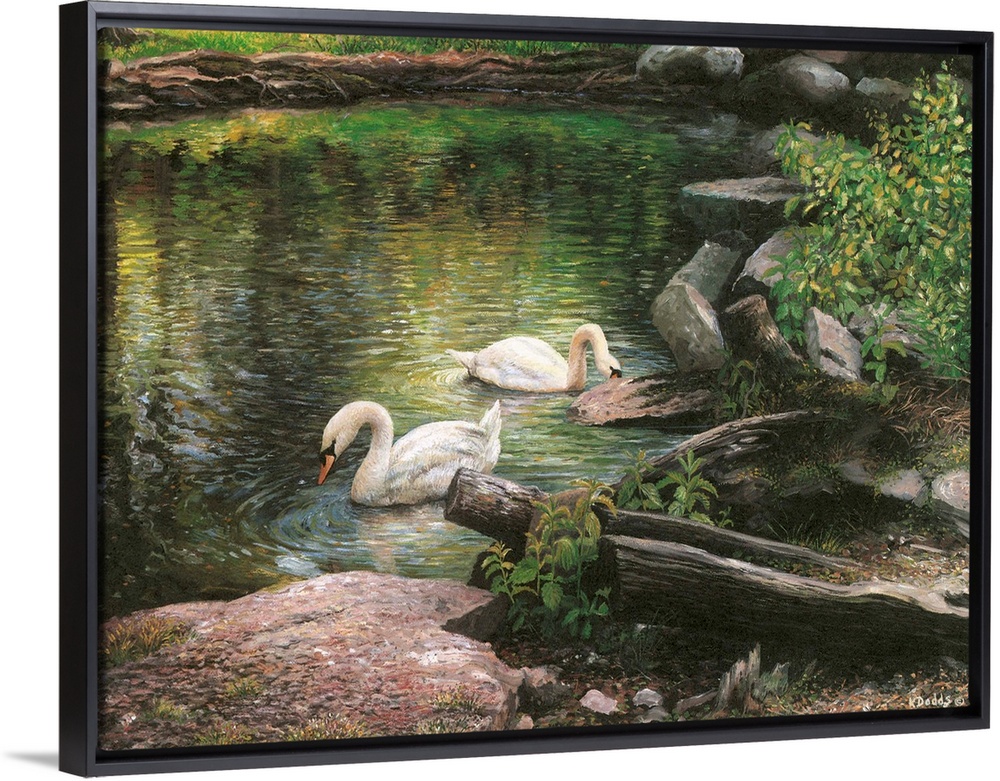 <p>Contemporary artwork of two swans swimming in a pond.</p>