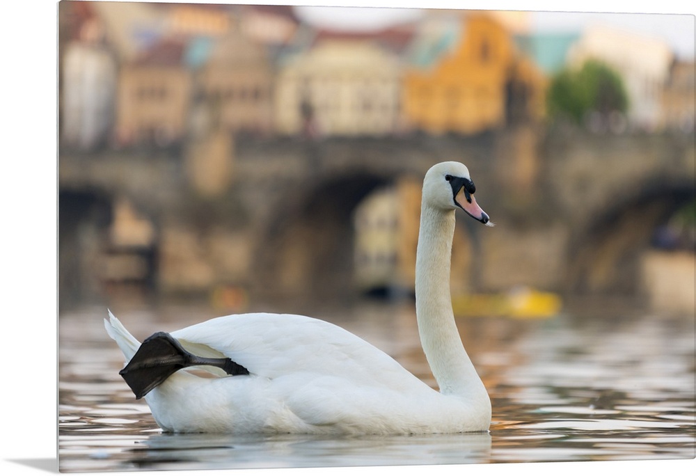 <p>Swan with Charles Bridge in background, Prague, Czech Republic (Czechia), Europe</p>