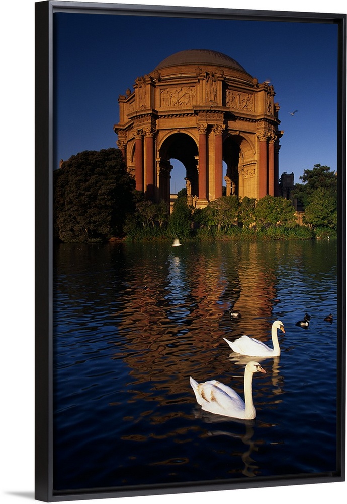 <p>Tall canvas print of two swans swimming in a lake in front of a big monument.</p>