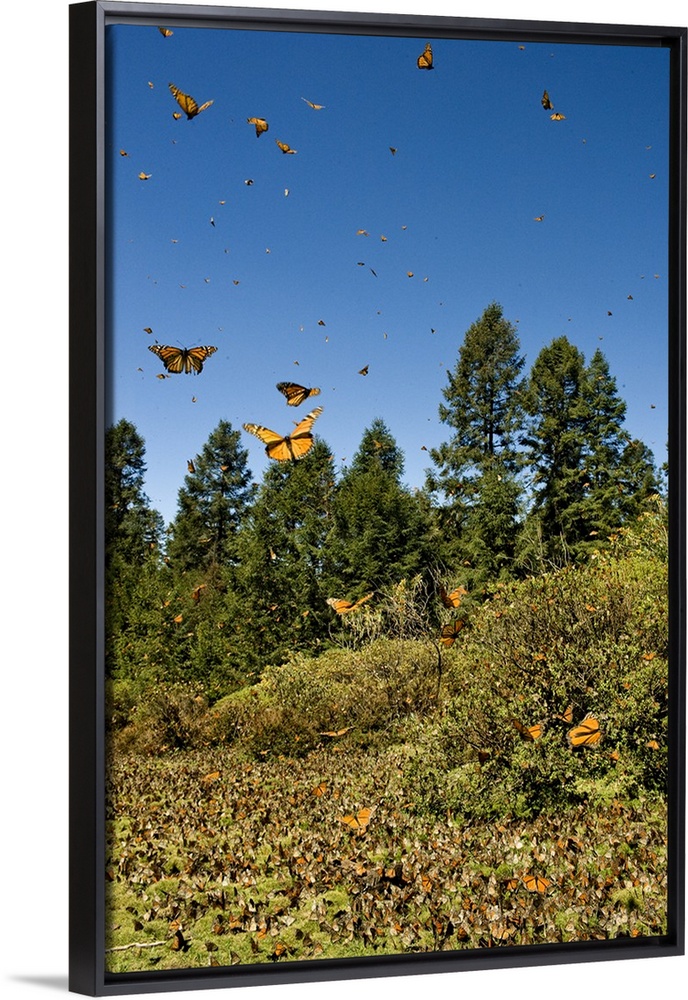 <p>Swarm of Monarch Butterflies in flight and in meadow, El Rosario Monarch Butterfly Reserve, Michoacan, near Angangueilo, Mexico.</p>