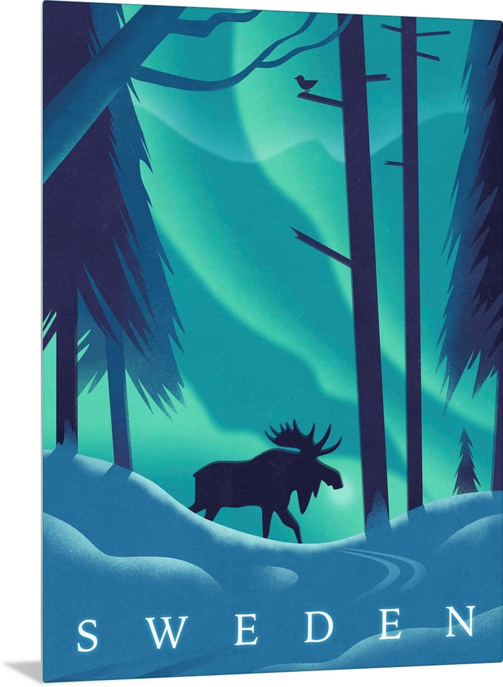 Art Blue Wall Art Decorative Art Graphic Art Landscapes Sweden Travel Posters Contemporary Travel Posters Martin Wickstrom Wildlife Moose and Elk