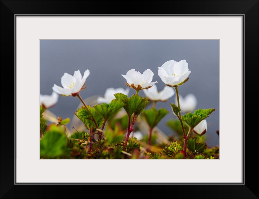 <p>Sweden, Norrbotten, Abisko, Stordalen Nature Preserve. Flowering Cloudberry plants (Rubus chamaemorus).</p>