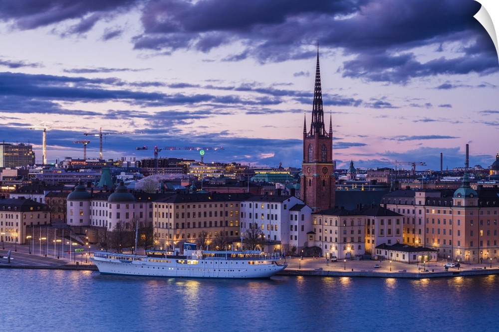 <p>Sweden, Stockholm, Gamla Stan, Old Town, elevated city view with Riddarholmeskyrkan church, dusk</p>