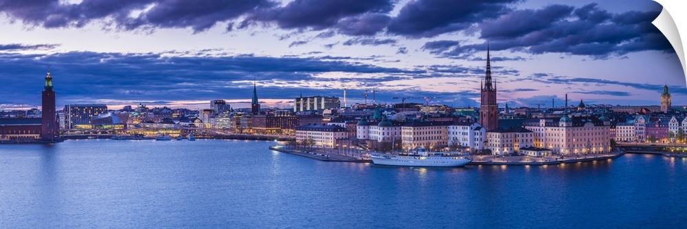 <p>Sweden, Stockholm, Gamla Stan, Old Town, elevated city view with Riddarholmeskyrkan church, dusk</p>
