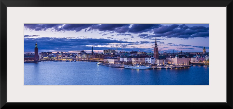 <p>Sweden, Stockholm, Gamla Stan, Old Town, elevated city view with Riddarholmeskyrkan church, dusk</p>