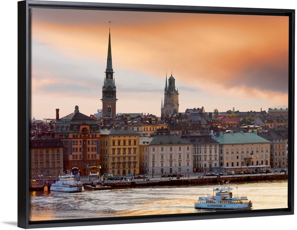 <p>Sweden, Stockholm, Riddarfjarden, Gamla Stan; passenger ferries in bay at dusk.</p>