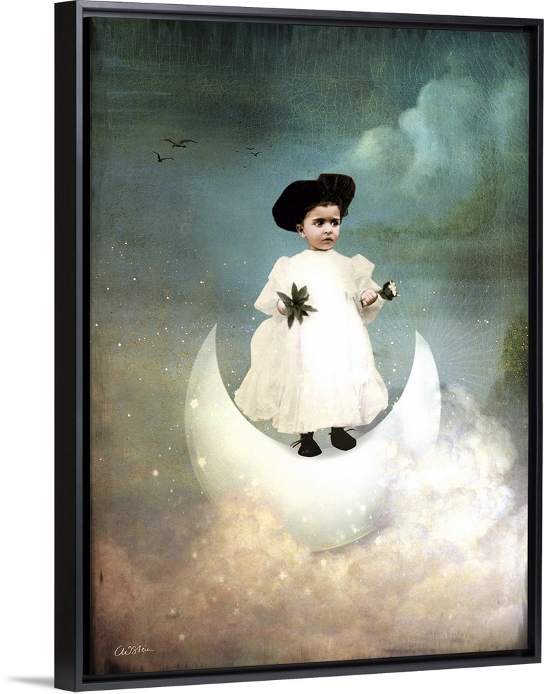 <p>A young child in white is standing of a crescent moon in the clouds.</p>