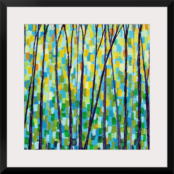 <p>Square abstract forest landscape with tall, thin, bare trees and short brushstrokes in the background in shades of green, blue, and yellow.</p>