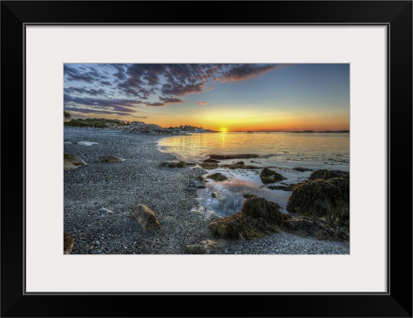 <p>A colorful sunset on a beach with rocks and stones in the foreground.</p>