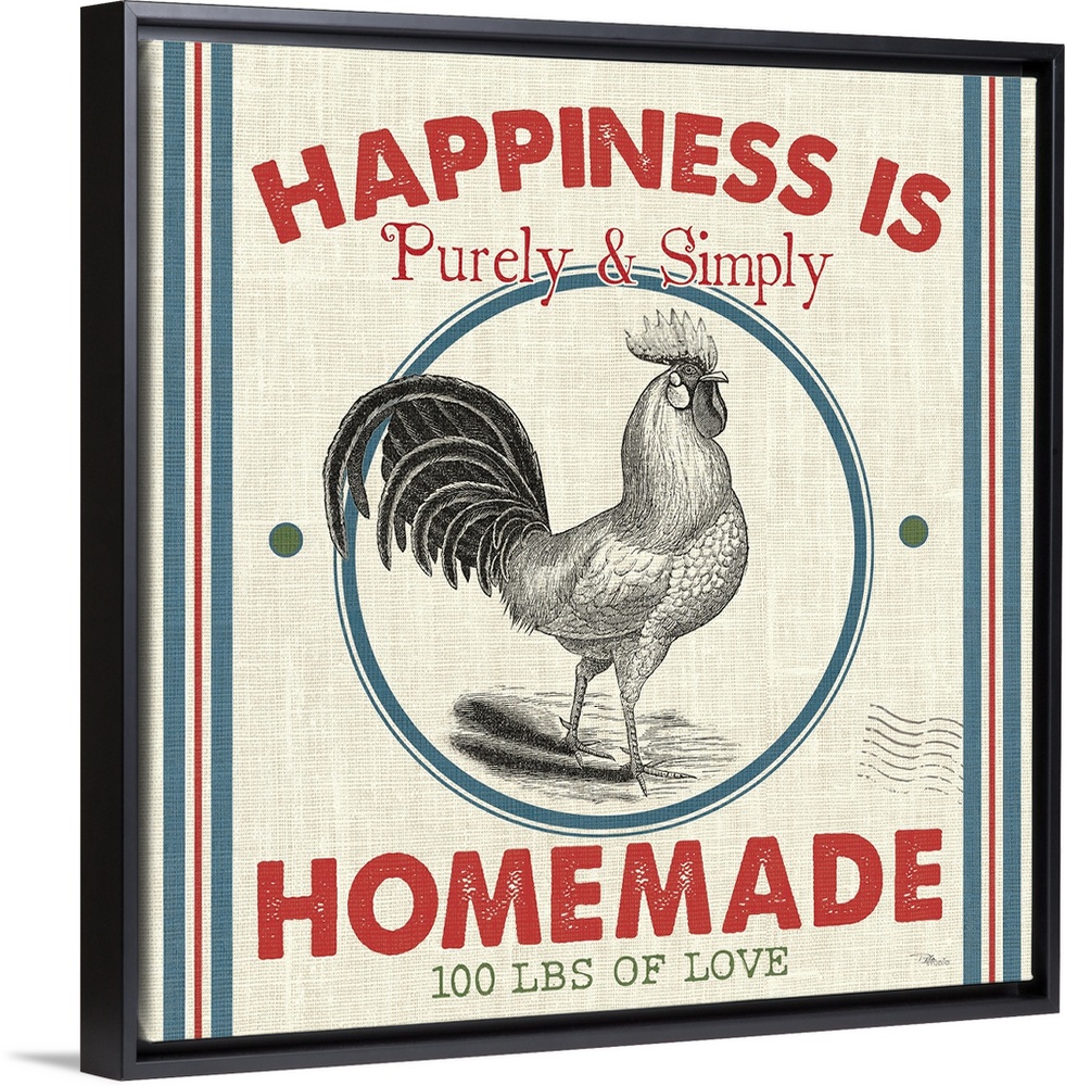<p>A square decorative design resembling a vintage feed sack with an illustration of a rooster and the text "Happiness Is Purely & Simply Homemade."</p>