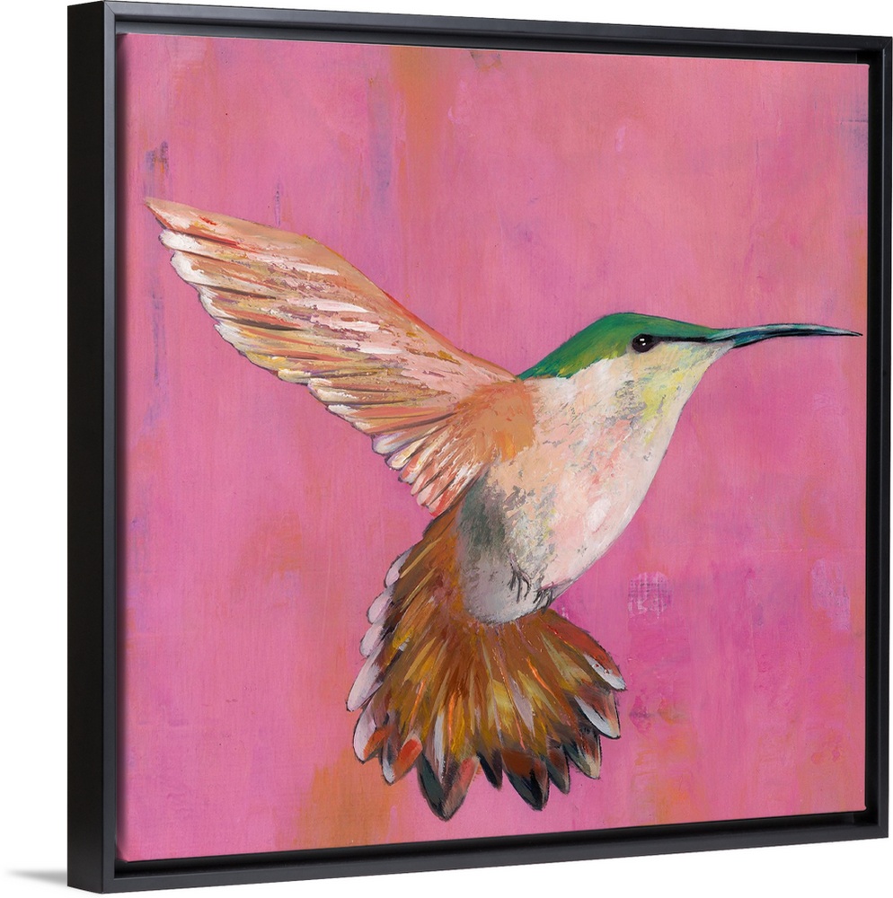 <p>Contemporary painting of a hummingbird hovering against a pink background.</p>