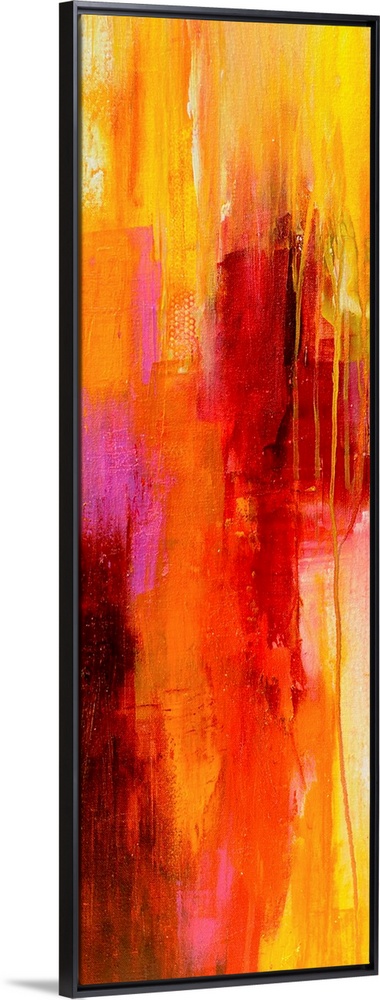 <p>Contemporary vertical panoramic painting of colorful linear brush strokes and running paint.</p>