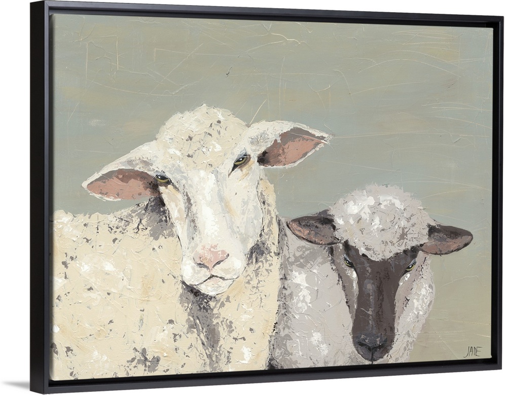 <p>Contemporary painting with two lambs, one ivory and the other in shades of gray, with textured brushstrokes all over.</p>