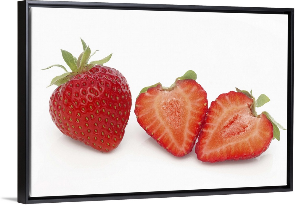 <p>Two fresh, ripe, home grown, organic strawberries, one cut into two halves, on a white background.</p>