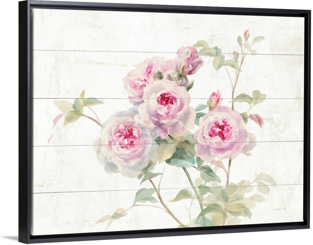 <p>Decorative artwork featuring romantic watercolor roses over white wood boards.</p>