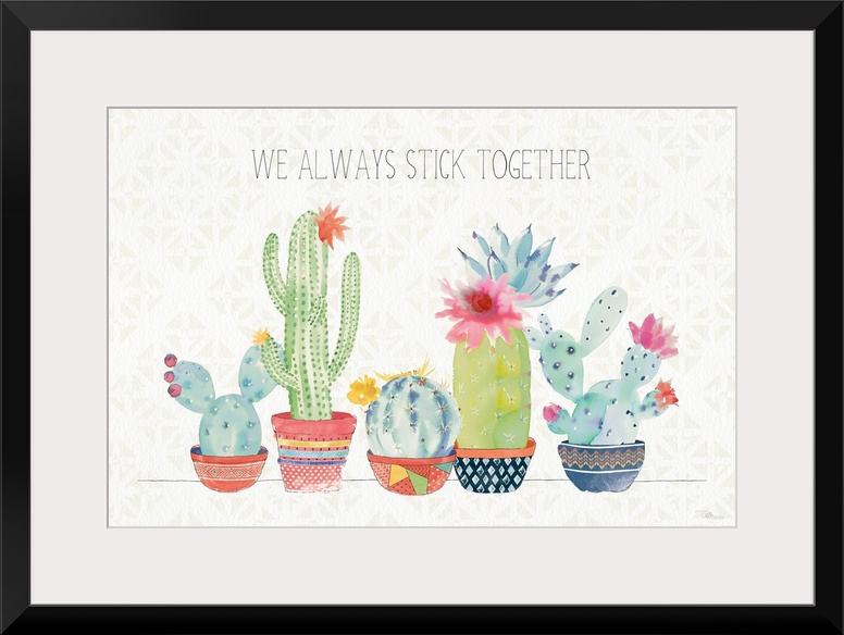 <p>Horizontal decorative artwork of a row of colorful cactus on a neutral background with the text "We Always Stick Together".</p>