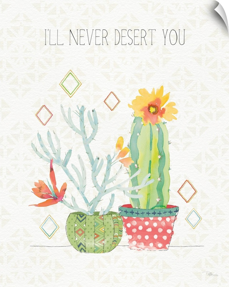 <p>Vertical decorative artwork of colorful cactus on a neutral background with the text "I'll Never Desert You".</p>