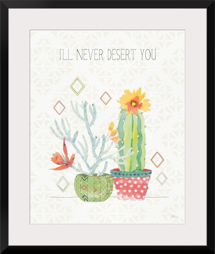 <p>Vertical decorative artwork of colorful cactus on a neutral background with the text "I'll Never Desert You".</p>