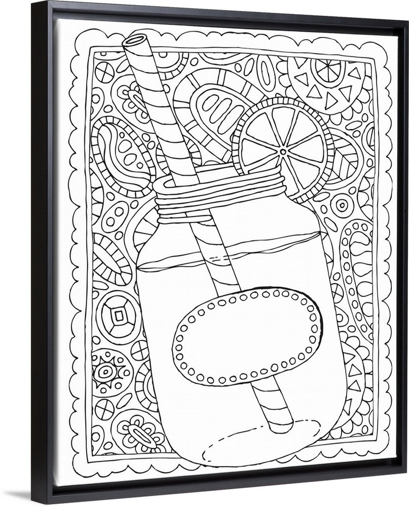 <p>Black and white line art of a mason jar full of sweet tea with a lemon the the rim on an intricately designed background.</p>