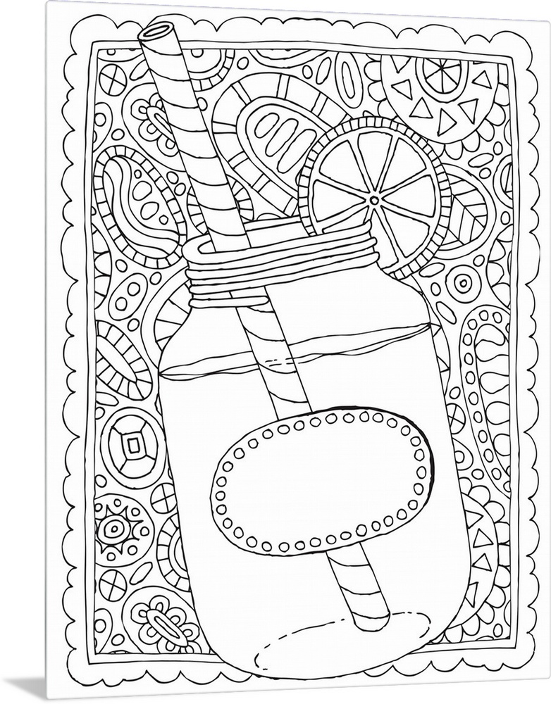 <p>Black and white line art of a mason jar full of sweet tea with a lemon the the rim on an intricately designed background.</p>