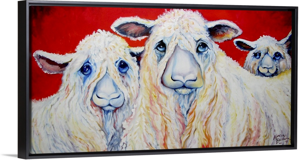 <p>Contemporary painting of three sheep with sad eyes on a red background.</p>