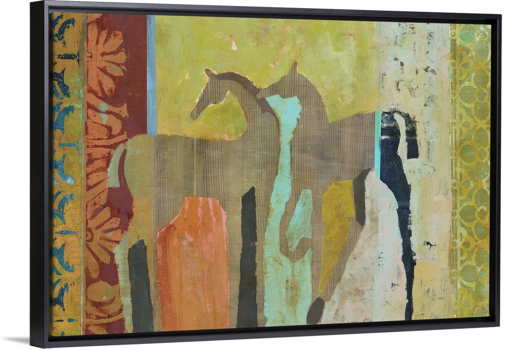 <p>Big painting of two horses on top of vertical strips of patterns.</p>