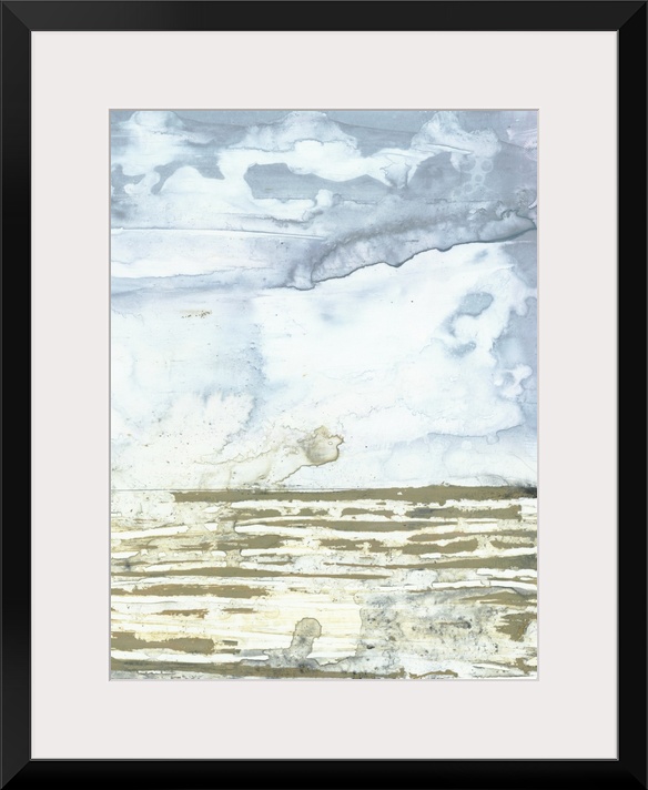 <p>This vertical abstract artwork features distressed texture colors of blue and tan to indicate a coastal scene.</p>
