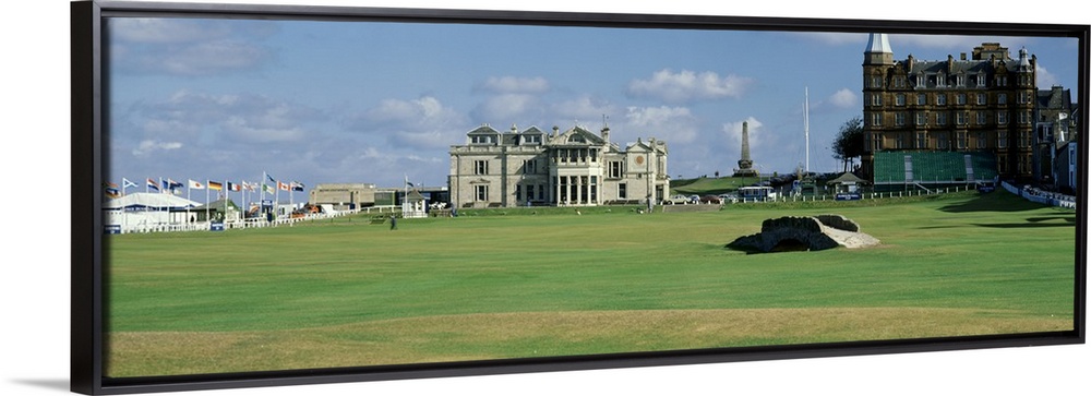 <p>Panoramic photograph on a large canvas of the green and buildings at the Swilcan Bridge, Royal Golf Club in St. Andrews, Scotland.</p>