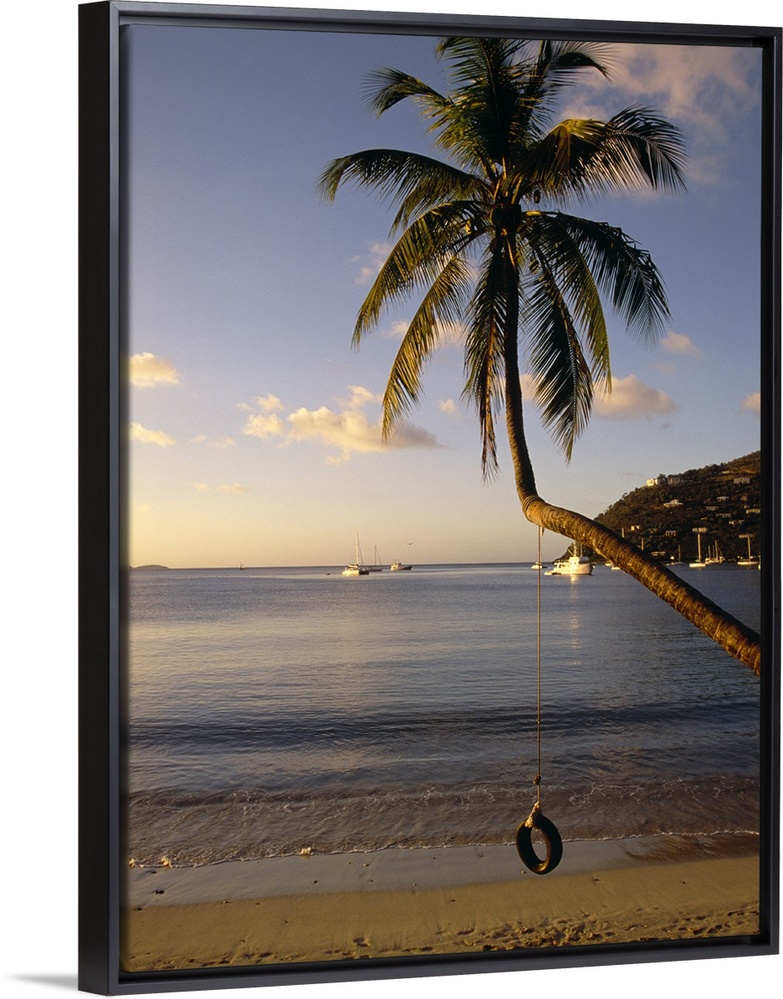 <p>A tire swing hangs from a crooked tree growing over the sandy beach at this tropical island harbor.</p>