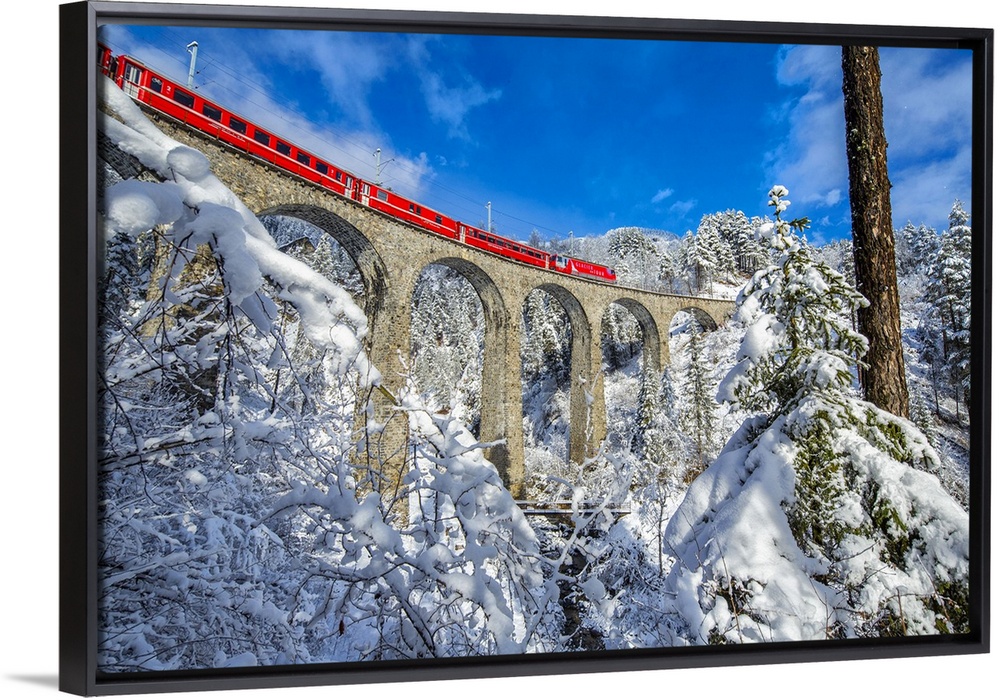 <p>Switzerland, Graubunden, Grigioni, Grisons, Alps, Bernina Express passes through the snowy woods Filisur</p>