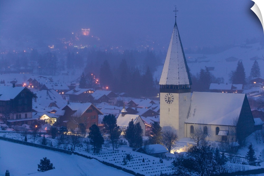 <p>SWITZERLAND-Bern-SAANEN (Area around Gstaad):.Town Church / Winter / Evening... Walter Bibikow 2005</p>
