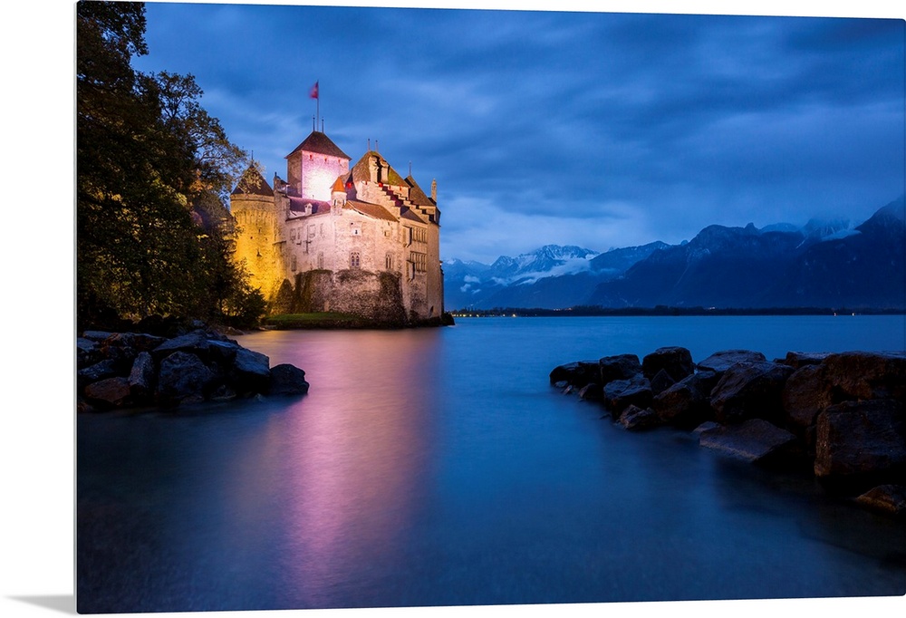 <p>Switzerland, Vaud, Lake Geneva, Alps, Lake Geneva, Lac Leman, Montreux, Chateau de Chillon.</p>