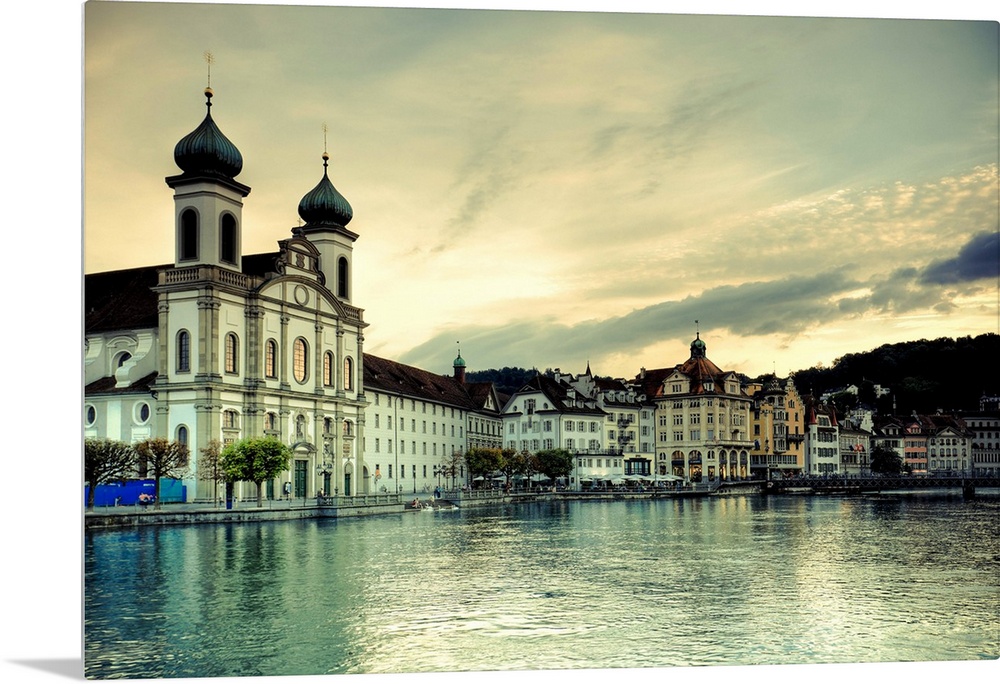 <p>Switzerland, Lucern (Luzern), Jesuit Church and River Reuss</p>