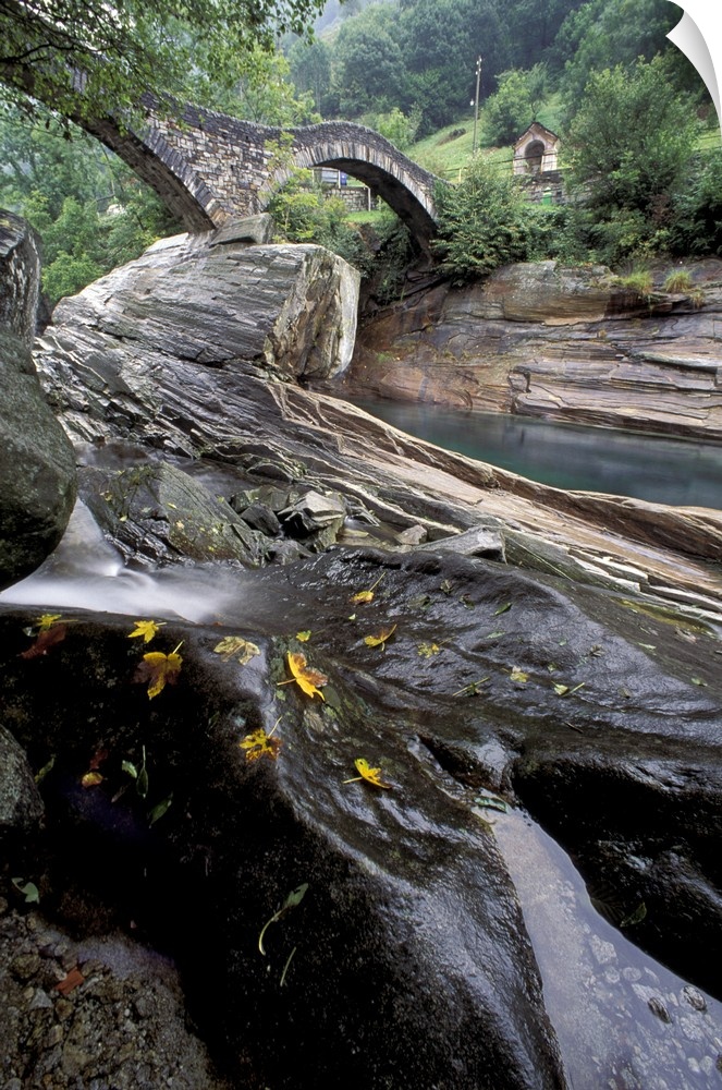 <p>EU, Switzerland, Ticino Region, Val Verzasca, River rock intrusions and bridge</p>