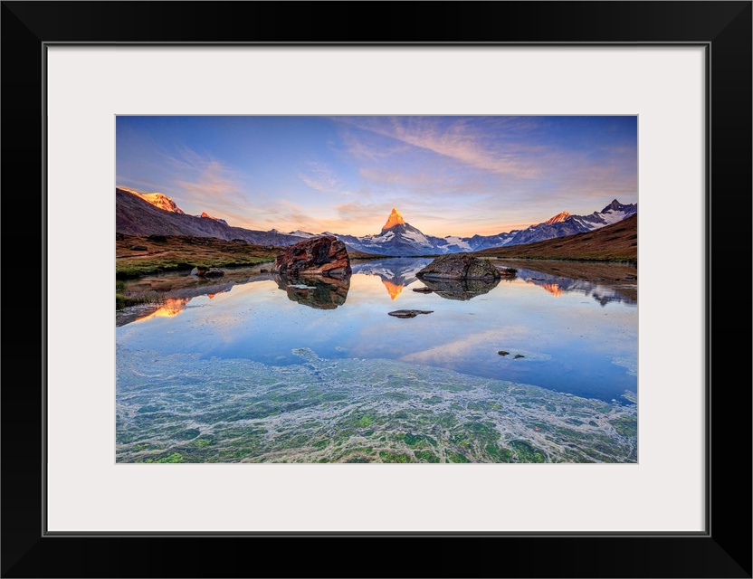 <p>Switzerland, Valais, Zermatt, Alps, Matterhorn (4478m), The Matterhorn reflected in Lake Stellisee at dawn Zermatt Pennine Alps.</p>