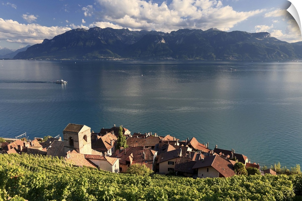 <p>Switzerland, Vaud, Lavaux Vineyards, St. Saphorin Village and Lac Leman / Lake Geneva</p>