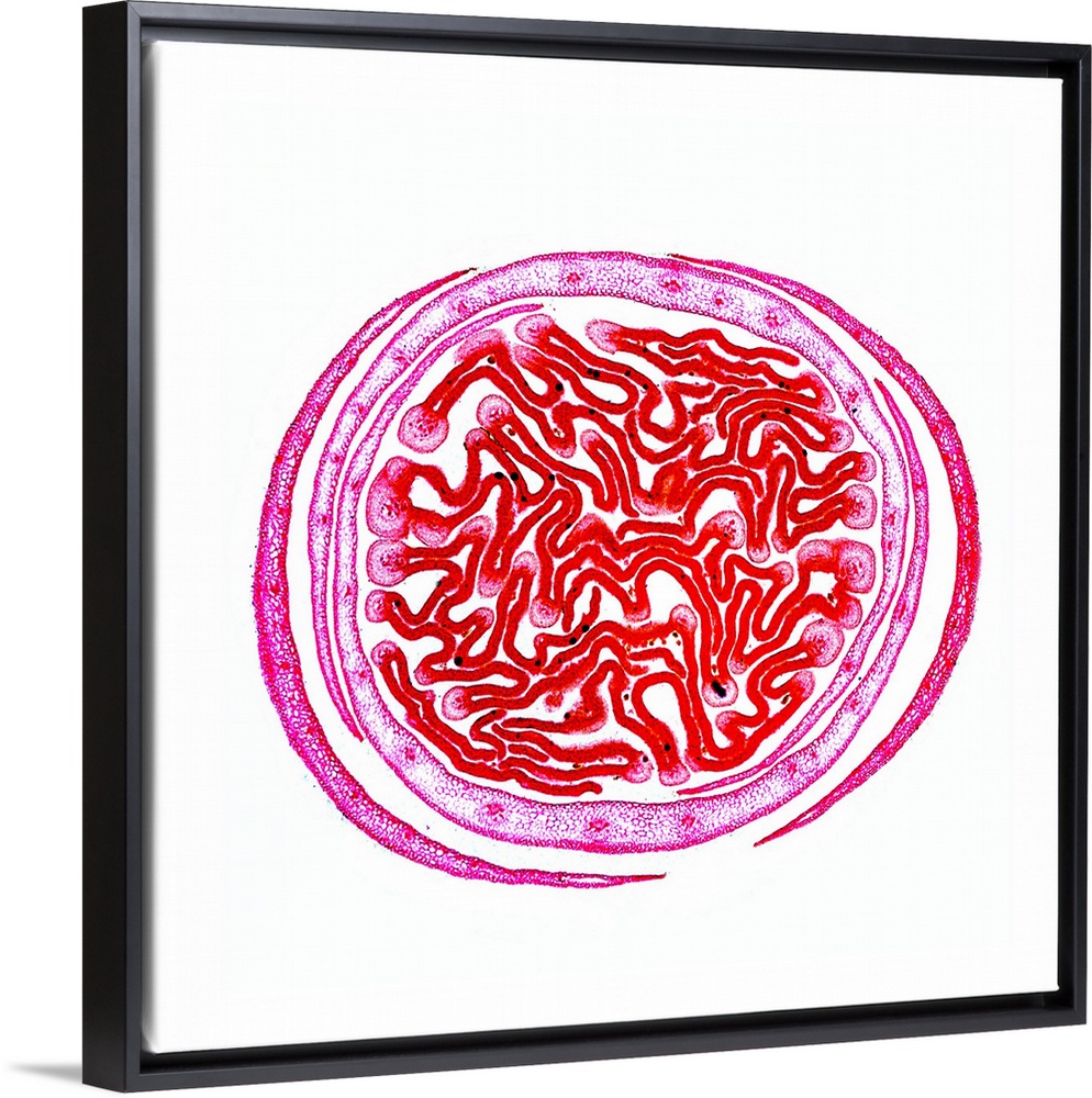 <p>Sycamore leaf bud (Acer pseudoplatanus). Light micrograph of a cross-section through a winter leaf bud from a sycamore tree. The leaf material (red) is surrounded by a protective layer of cork (pink).</p>