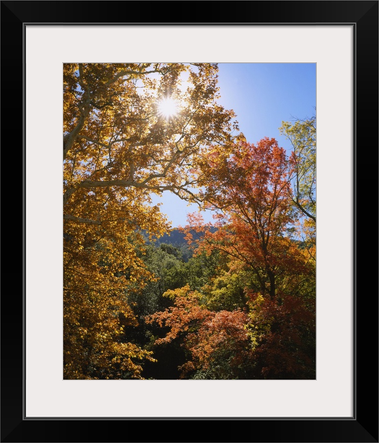 <p>Vertical, big photograph of the tops of large sycamore and maple trees with fall foliage, in Garden Canyon, Coronado National forest. The sun in shining brightly over the Huachuca Mountains in the background.</p>