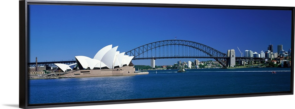 <p>This is a panoramic photograph of the harbor with the suspension bridge, opera house, and city skyline in the background.</p>