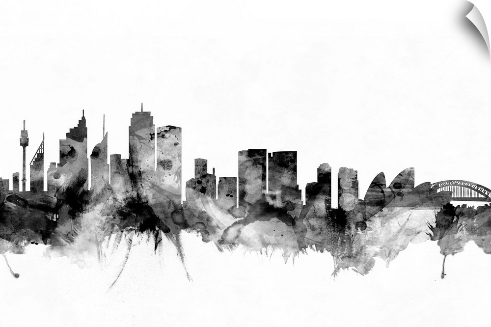<p>Contemporary artwork of the Sydney city skyline in black watercolor paint splashes.</p>
