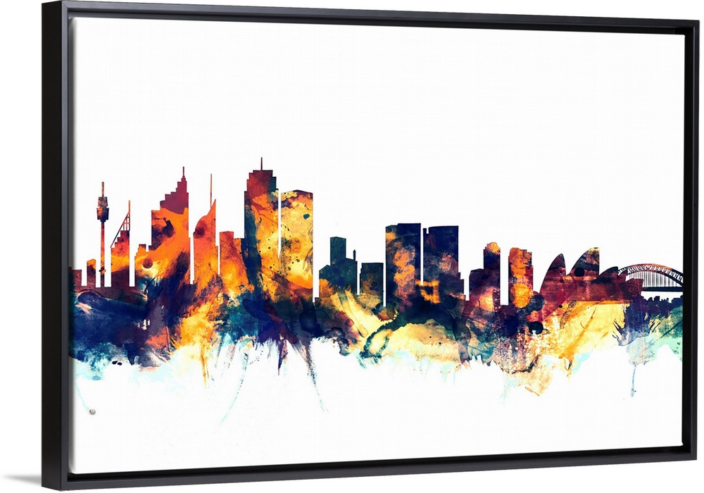 <p>Dark watercolor silhouette of the Sydney city skyline against a light blue background.</p>