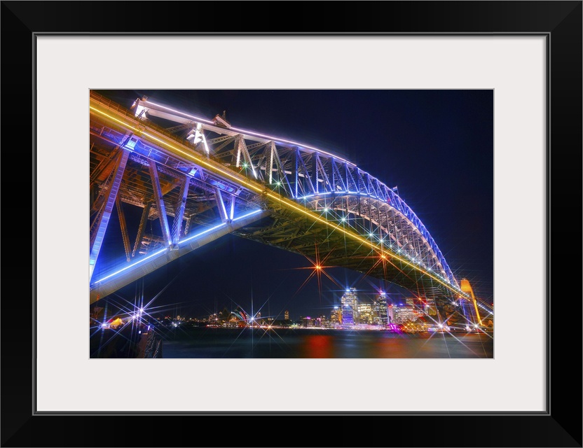 <p>Photograph of the Sydney Harbor skyline from under the massive neon lit bridge.</p>