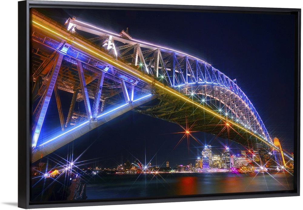 <p>Photograph of the Sydney Harbor skyline from under the massive neon lit bridge.</p>
