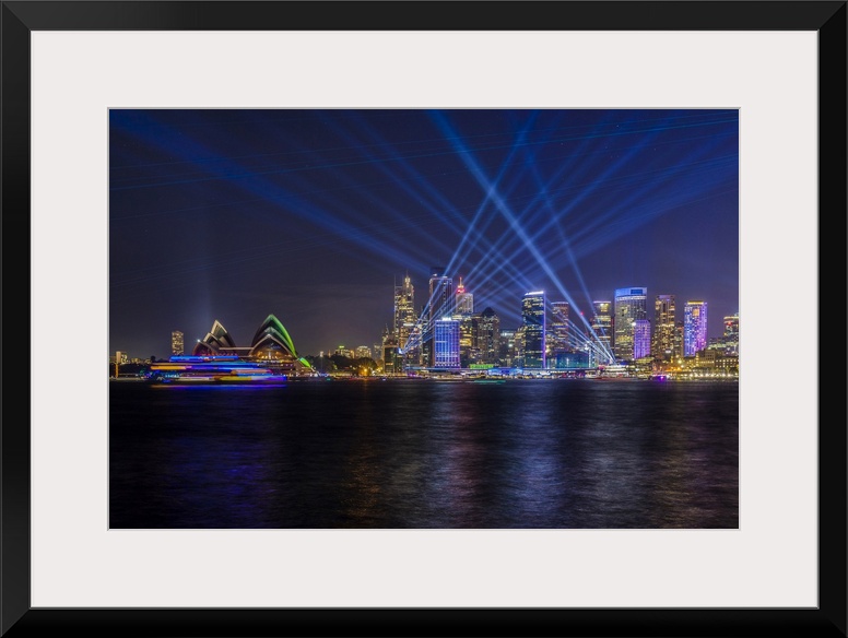 <p>Sydney Opera House and skyline illuminated with projections and lasers during Sydney Solstice celebrations, Sydney, New South Wales, Australia.</p>