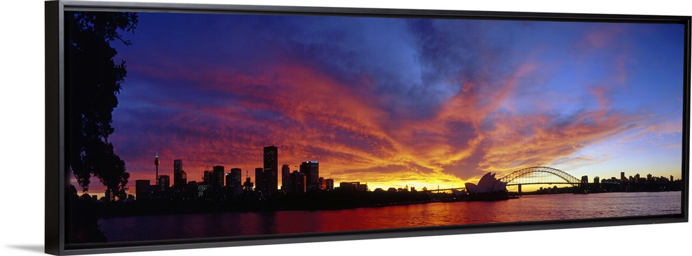 <p>The Sydney skyline is photographed in panoramic view as the sky is lit up with vibrant colors from the sunset.</p>