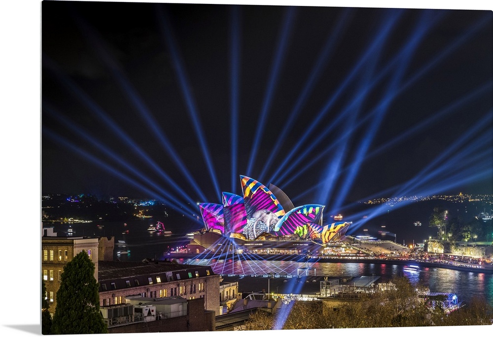 <p>Sydney Opera House illuminated with lasers and projections during Vivid Sydney festival, Sydney, New South Wales, Australia.</p>